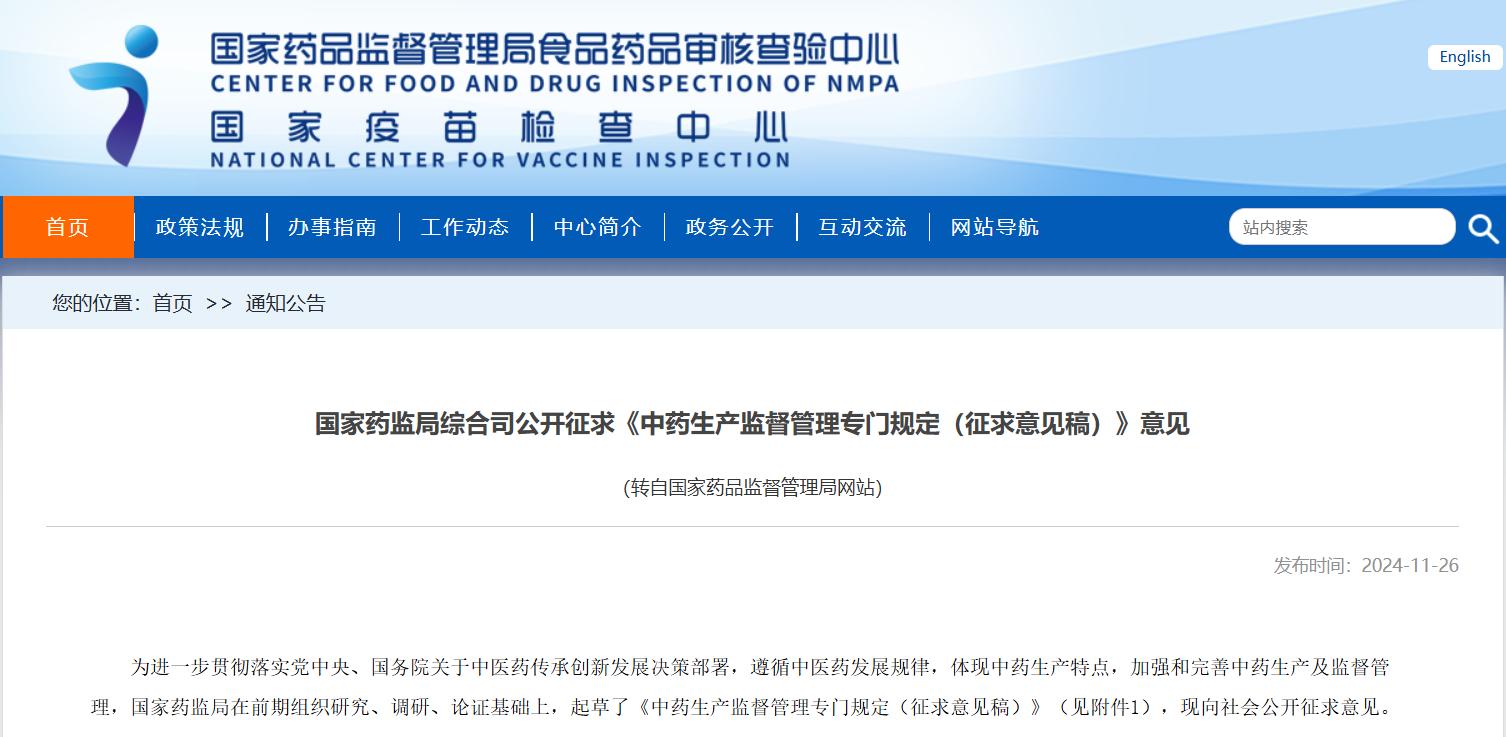 國(guó)家藥監(jiān)局綜合司公開(kāi)征求《中藥生產(chǎn)監(jiān)督管理專門(mén)規(guī)定(征求意見(jiàn)稿)》意見(jiàn)
