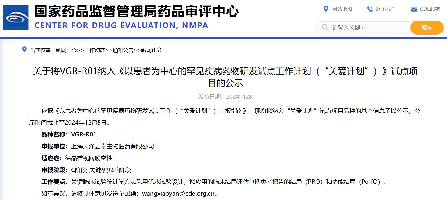 關(guān)于將VGR-R01納入《以患者為中心的罕見(jiàn)疾病藥物研發(fā)試點(diǎn)工作計(jì)劃(“關(guān)愛(ài)計(jì)劃”)》試點(diǎn)項(xiàng)目的公示