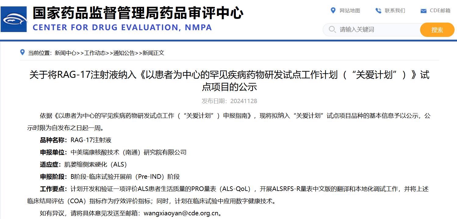 關(guān)于將RAG-17注射液納入《以患者為中心的罕見(jiàn)疾病藥物研發(fā)試點(diǎn)工作計(jì)劃(“關(guān)愛(ài)計(jì)劃”)》試點(diǎn)項(xiàng)目的公示