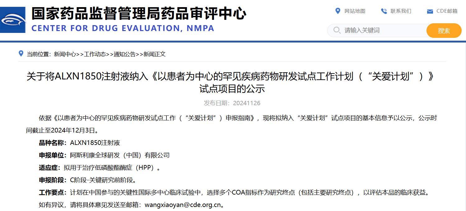 關(guān)于將ALXN1850注射液納入《以患者為中心的罕見(jiàn)疾病藥物研發(fā)試點(diǎn)工作計(jì)劃(“關(guān)愛(ài)計(jì)劃”)》試點(diǎn)項(xiàng)目的公示