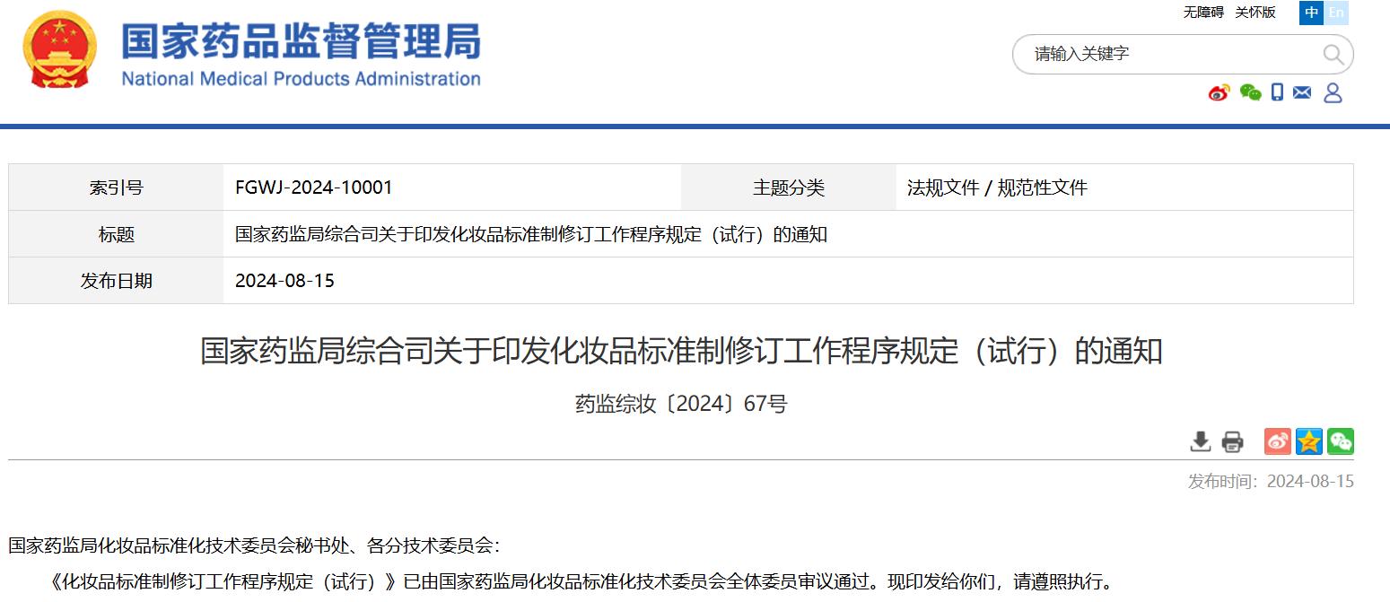 國(guó)家藥監(jiān)局綜合司關(guān)于印發(fā)化妝品標(biāo)準(zhǔn)制修訂工作程序規(guī)定(試行)的通知