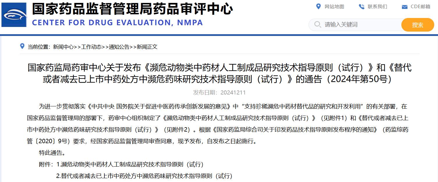 國家藥監(jiān)局藥審中心關(guān)于發(fā)布《瀕危動(dòng)物類中藥材人工制成品研究技術(shù)指導(dǎo)原則(試行)》和《替代或者減去已上市中藥處方中瀕危藥味研究技術(shù)指導(dǎo)原則(試行)》的通告(2024年第50號(hào))
