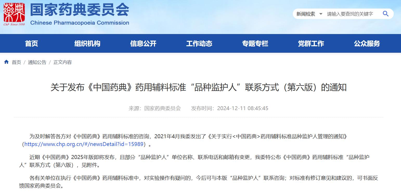 關(guān)于發(fā)布《中國藥典》藥用輔料標(biāo)準(zhǔn)“品種監(jiān)護(hù)人”聯(lián)系方式(第六版)的通知
