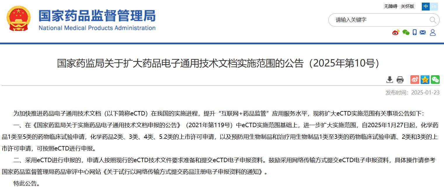 國家藥監局關于擴大藥品電子通用技術文檔實施范圍的公告(2025年第10號)