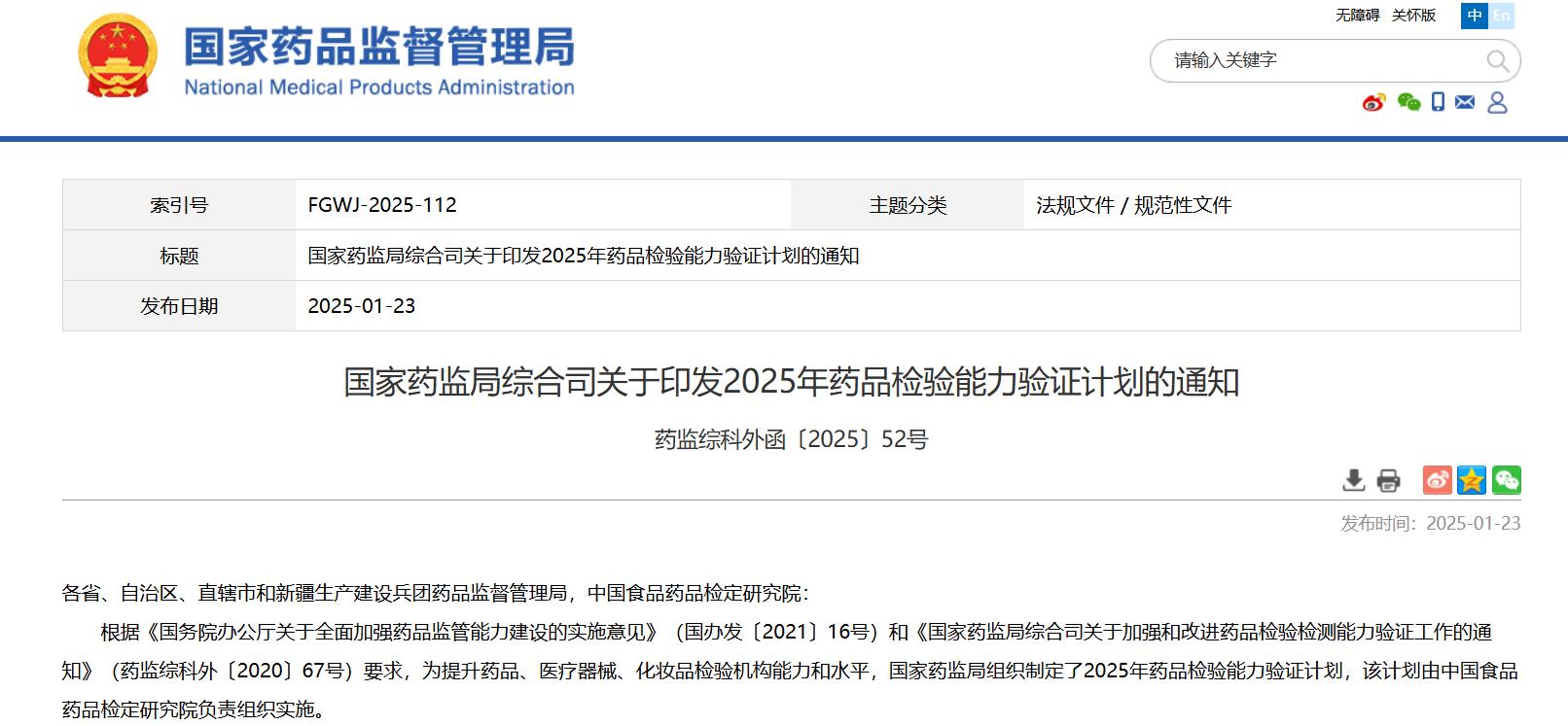 國家藥監局綜合司關于印發2025年藥品檢驗能力驗證計劃的通知