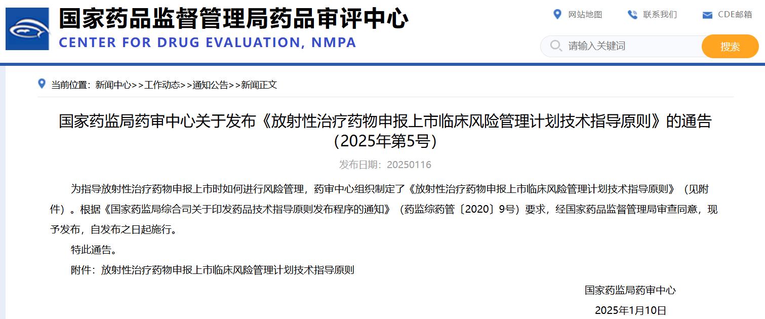 國家藥監局藥審中心關于發布《放射性治療藥物申報上市臨床風險管理計劃技術指導原則》的通告(2025年第5號)