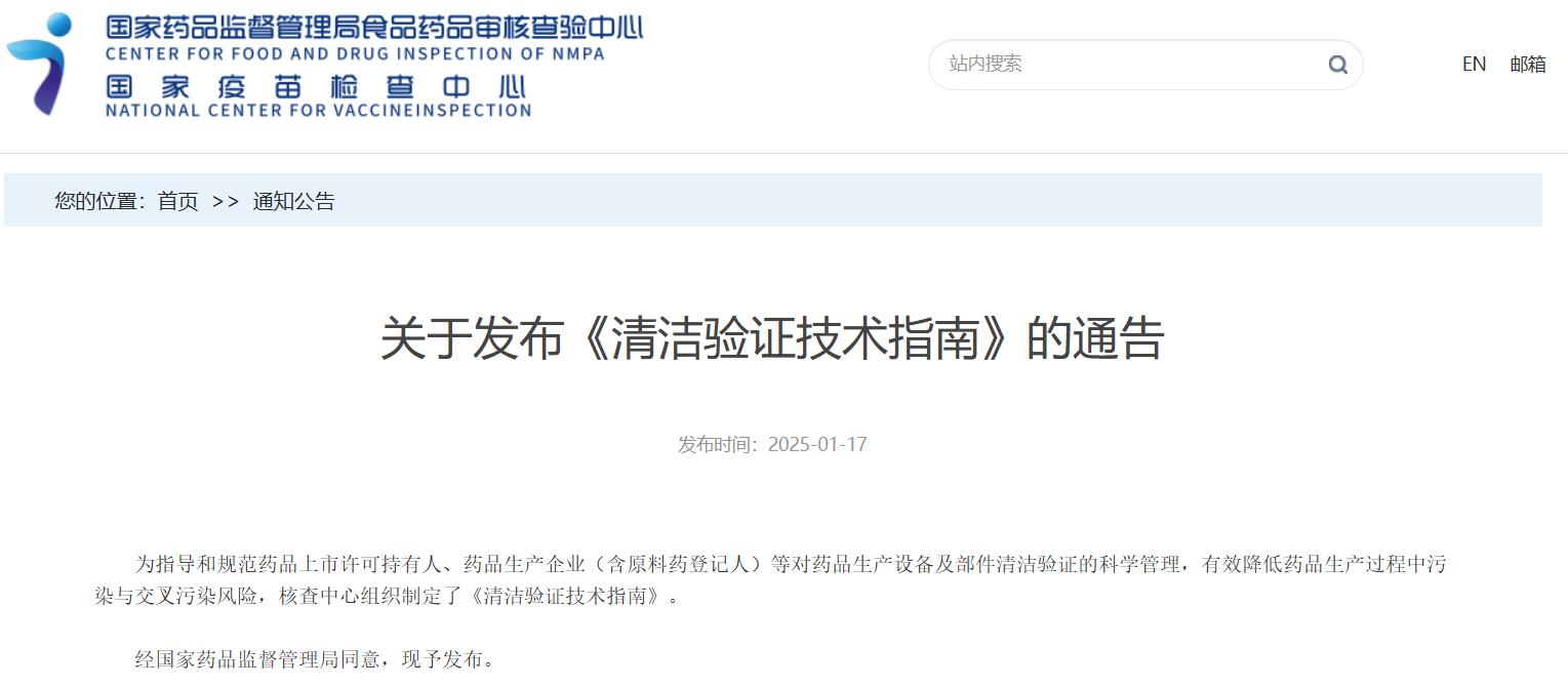 國家藥監局核查中心關于發布《清潔驗證技術指南》的通告