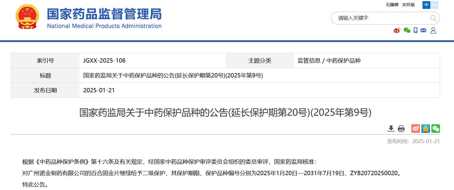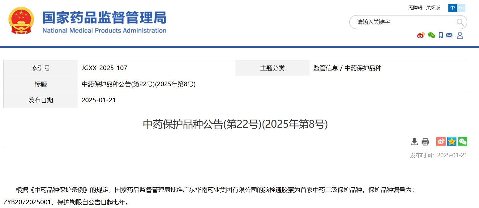 國家藥監局關于中藥保護品種的公告(延長保護期第20號)(2025年第9號)