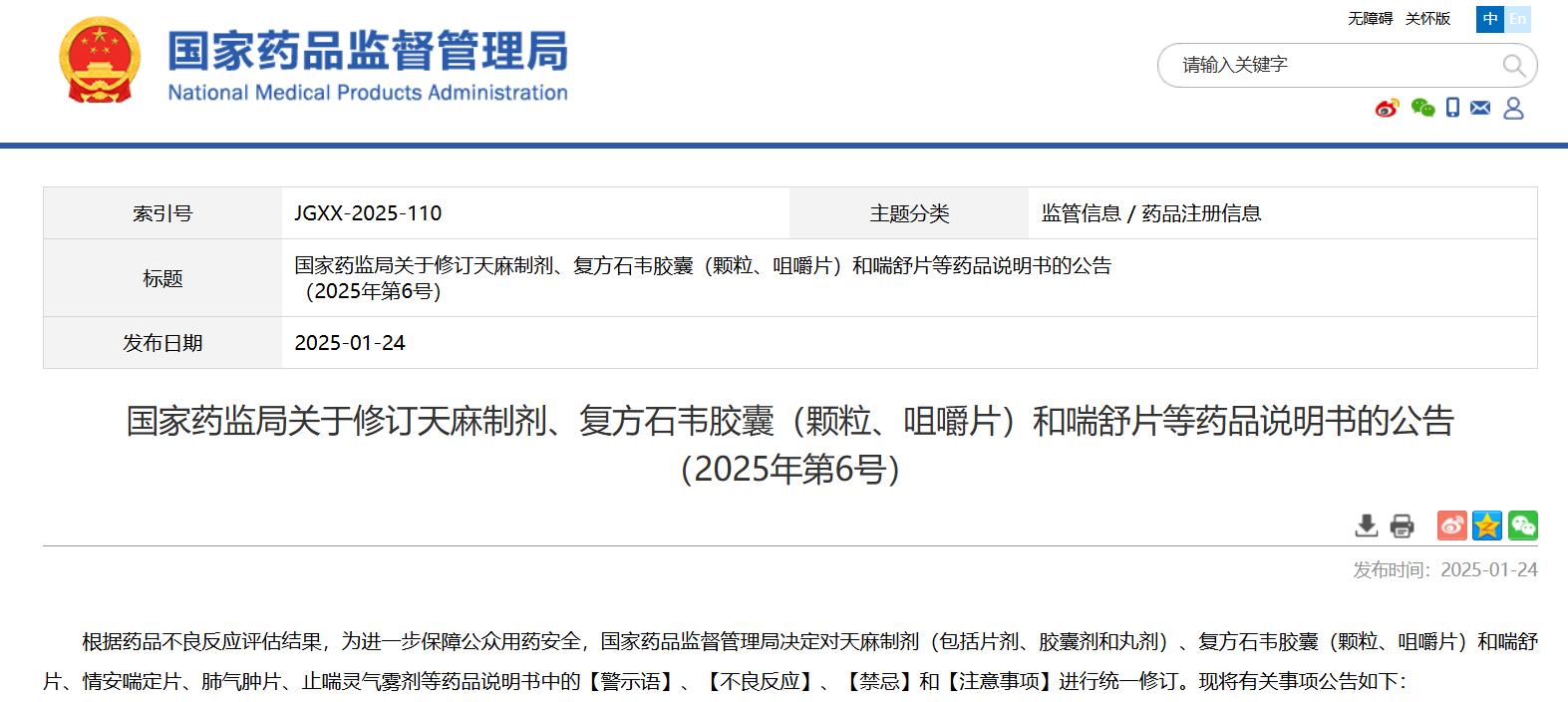 國家藥監局關于修訂天麻制劑、復方石韋膠囊(顆粒、咀嚼片)和喘舒片等藥品說明書的公告(2025年第6號)