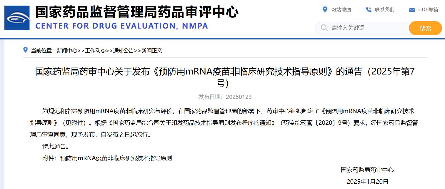 國家藥監局藥審中心關于發布《預防用mRNA疫苗非臨床研究技術指導原則》的通告(2025年第7號)