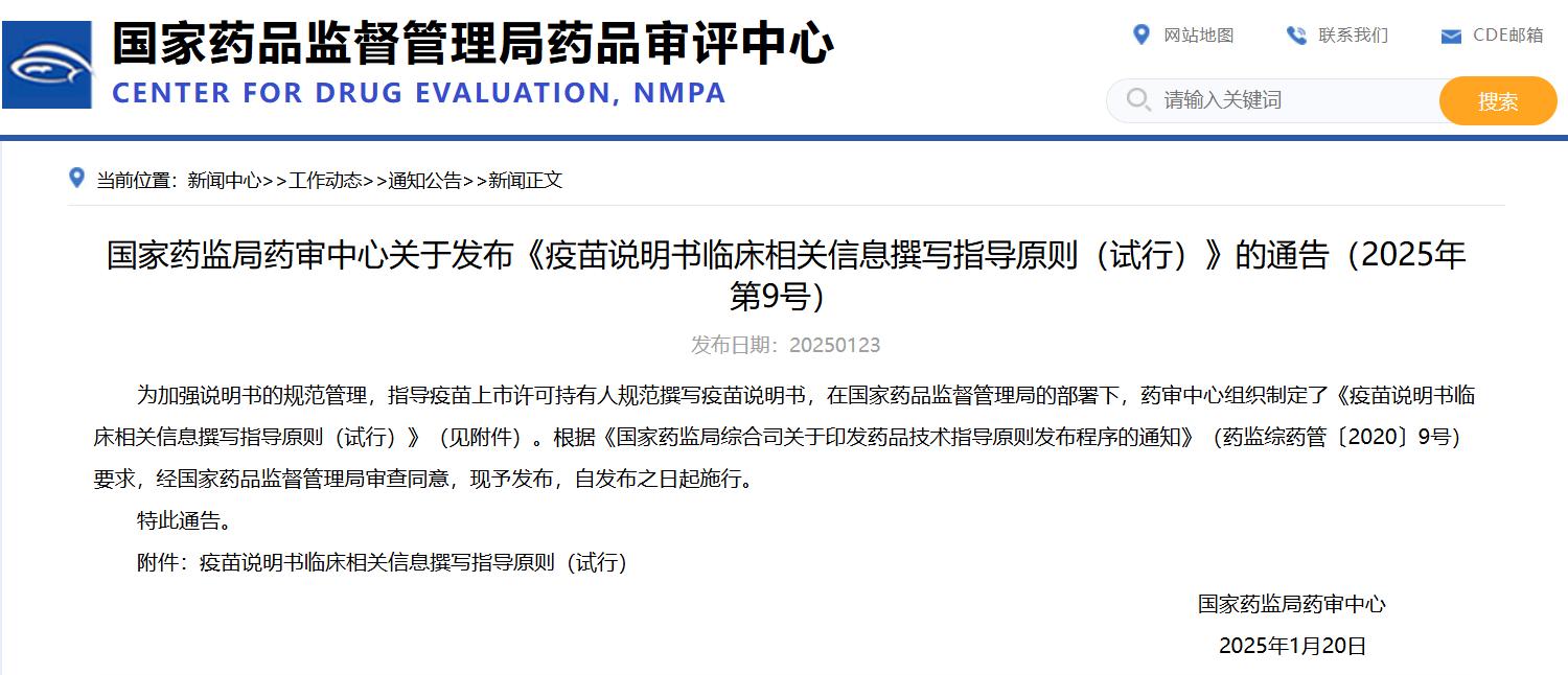 國家藥監局藥審中心關于發布《疫苗說明書臨床相關信息撰寫指導原則(試行)》的通告(2025年第9號)