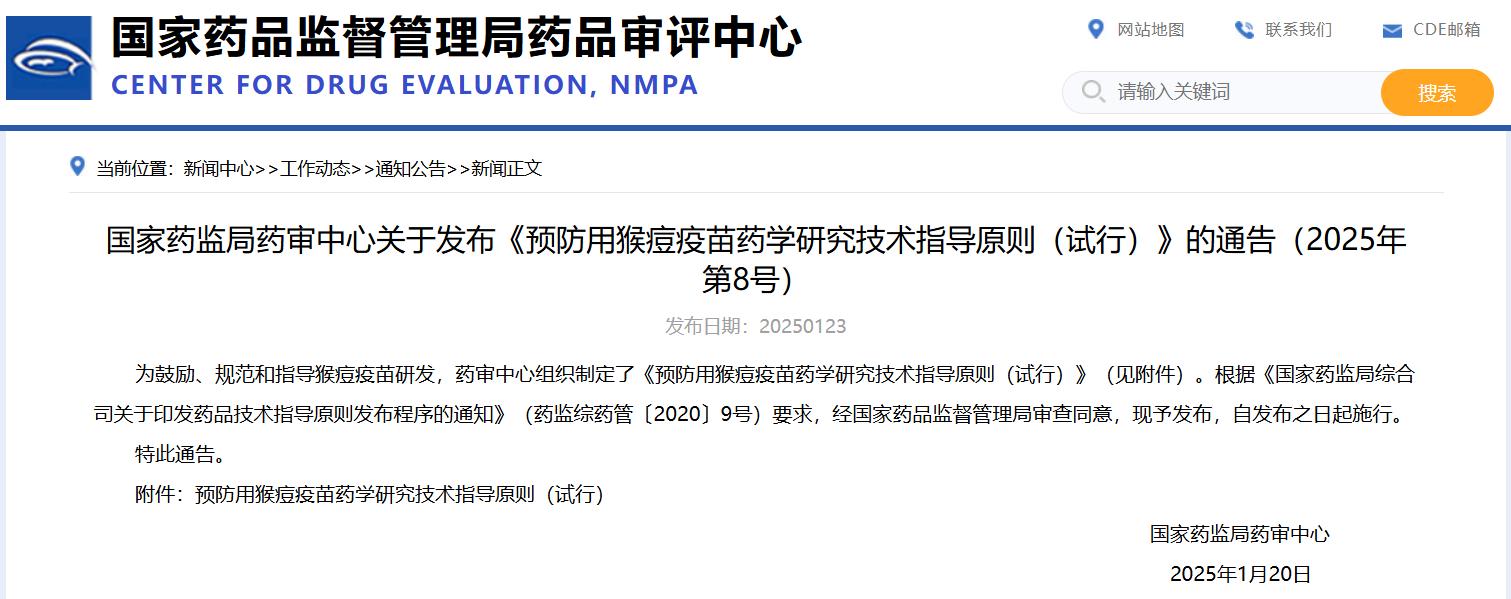 國家藥監局藥審中心關于發布《預防用猴痘疫苗藥學研究技術指導原則(試行)》的通告(2025年第8號)