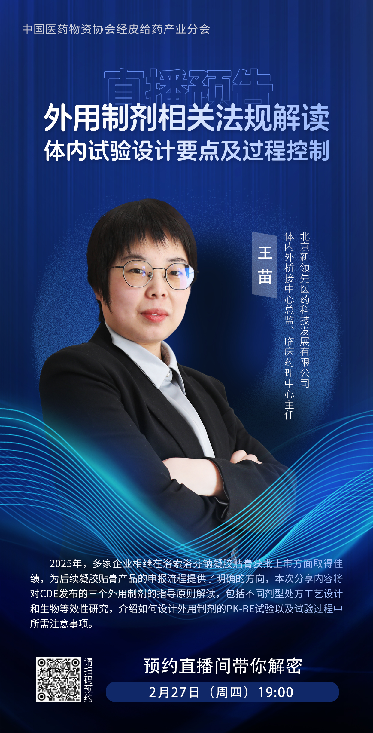 為幫助大家深入理解這些關鍵內容,2月27日(本周四),中國醫藥物資協會經皮給藥產業分會副會長單位,北京新領先醫藥科技發展有限公司體內外橋接中心總監、臨床藥理中心主任王苗,為大家帶來《外用制劑相關法規解讀,體內試驗設計要點及過程控制》的專業解讀。王苗主任憑借深厚的專業知識和豐富的實踐經驗,將針對CDE發布的三個外用制劑指導原則進行深度剖析,包括不同劑型處方工藝設計和生物等效性研究;介紹如何設計外用制劑的PK-BE試驗以及試驗過程中所需注意事項。