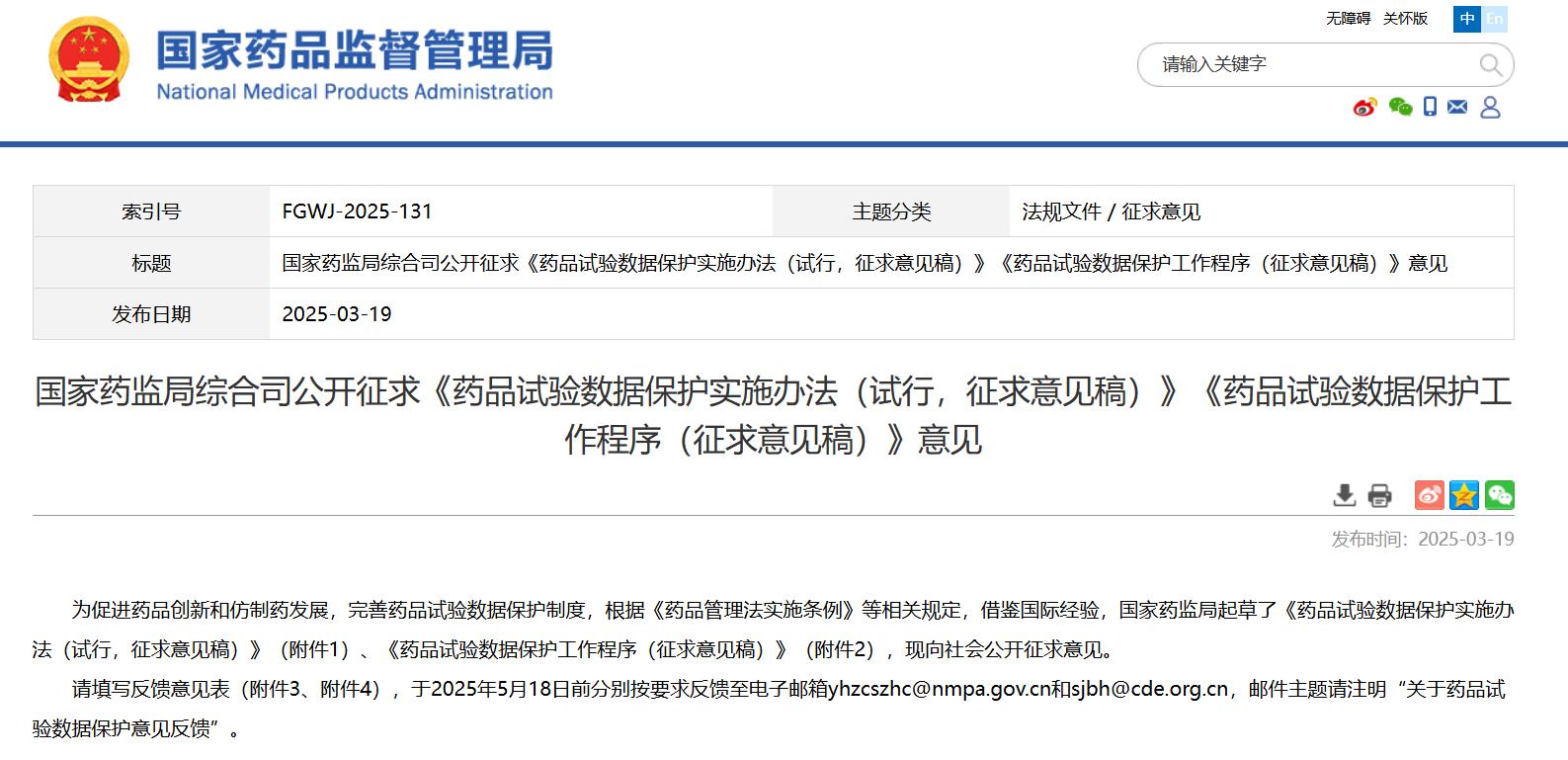 國家藥監局綜合司公開征求《藥品試驗數據保護實施辦法(試行,征求意見稿)》《藥品試驗數據保護工作程序(征求意見稿)》意見