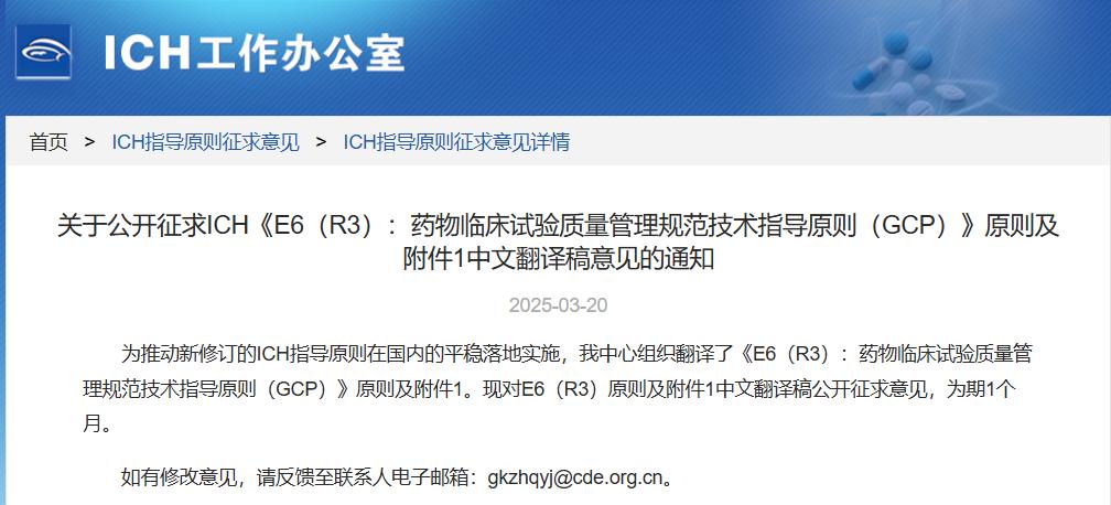 關于公開征求ICH《E6(R3):藥物臨床試驗質量管理規范技術指導原則(GCP)》原則及附件1中文翻譯稿意見的通知