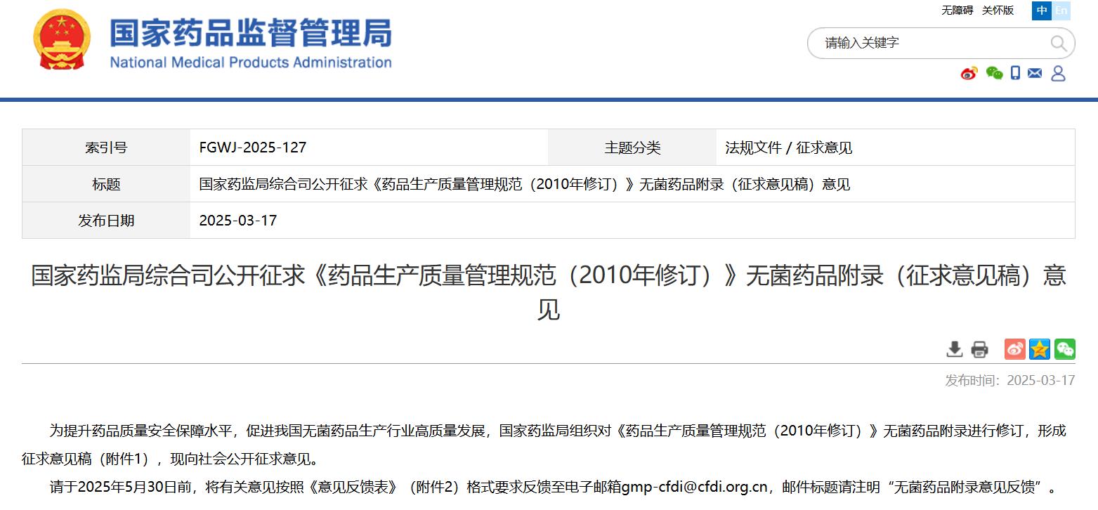 國家藥監局綜合司公開征求《藥品生產質量管理規范(2010年修訂)》無菌藥品附錄(征求意見稿)意見