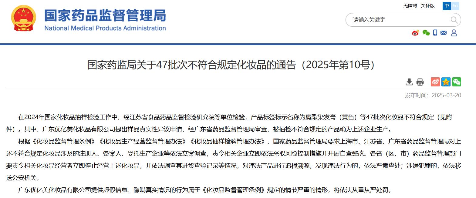 國家藥監局關于47批次不符合規定化妝品的通告(2025年第10號)