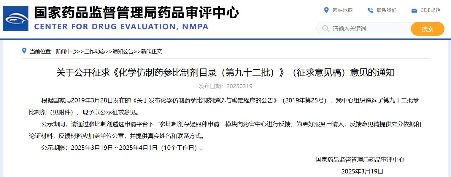 關于公開征求《化學仿制藥參比制劑目錄(第九十二批)》(征求意見稿)意見的通知
