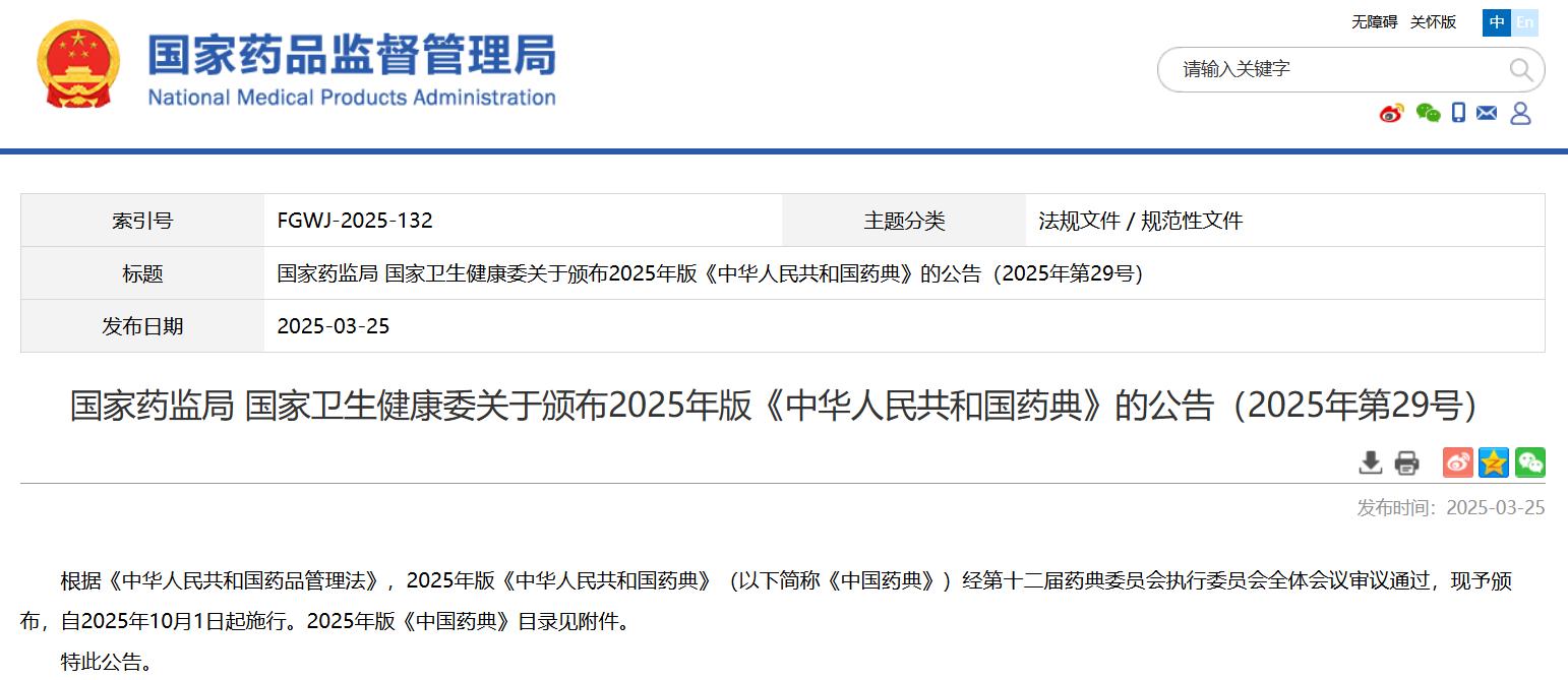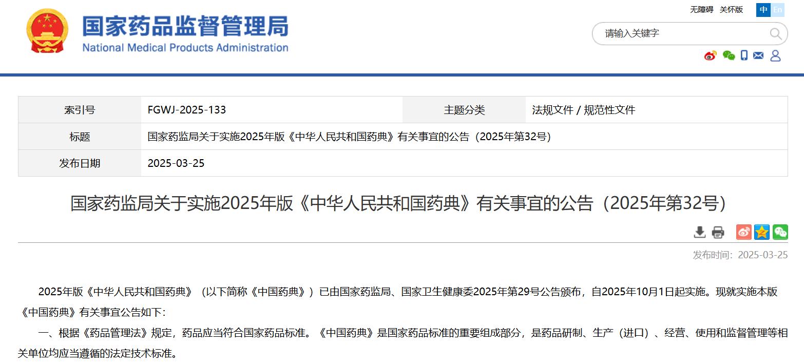 國(guó)家藥監(jiān)局關(guān)于實(shí)施2025年版《中華人民共和國(guó)藥典》有關(guān)事宜的公告(2025年第32號(hào))