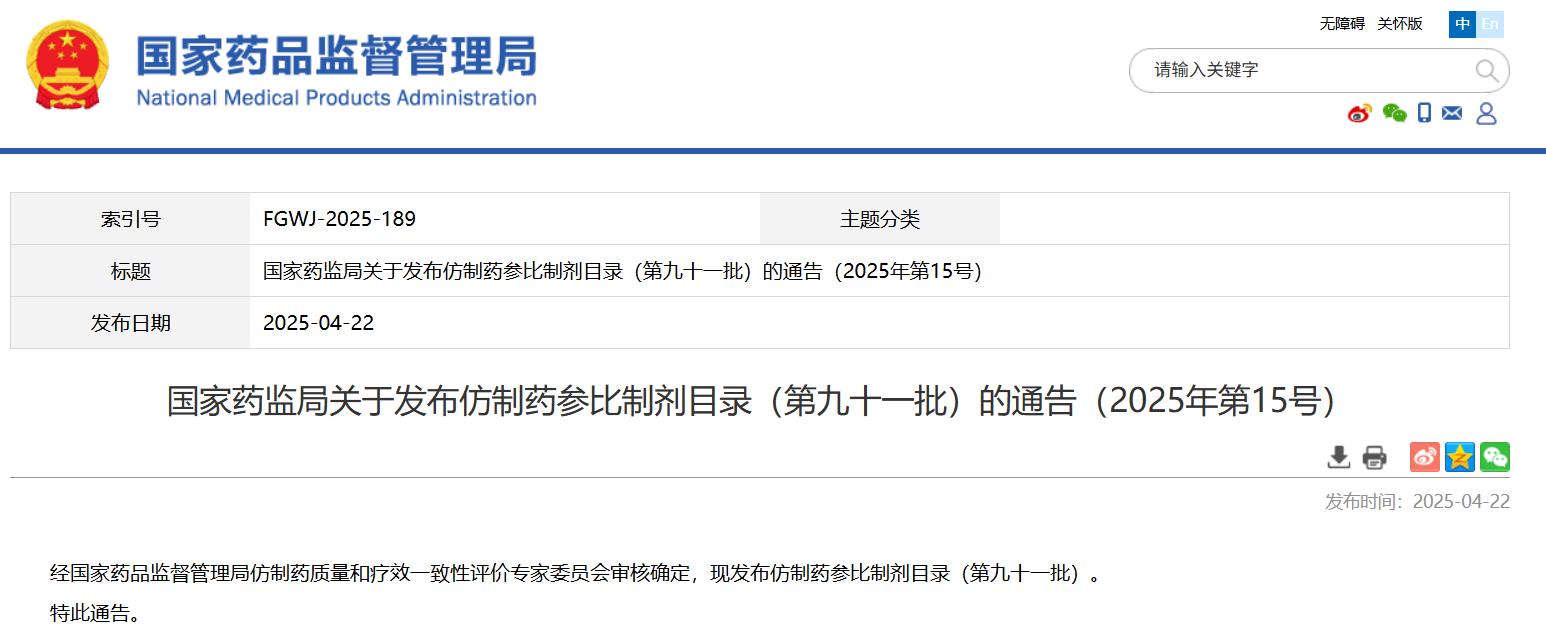國家藥監局關于發布仿制藥參比制劑目錄(第九十一批)的通告(2025年第15號)