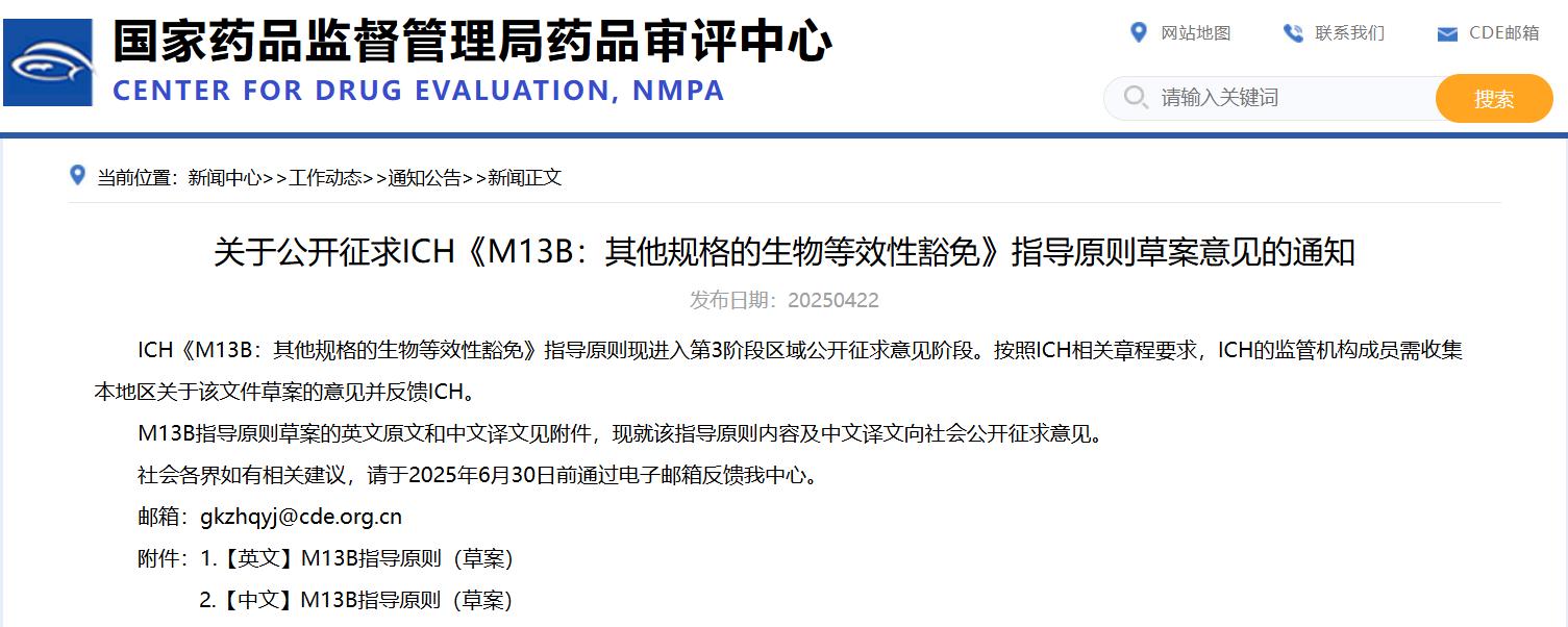 關于公開征求ICH《M13B:其他規格的生物等效性豁免》指導原則草案意見的通知