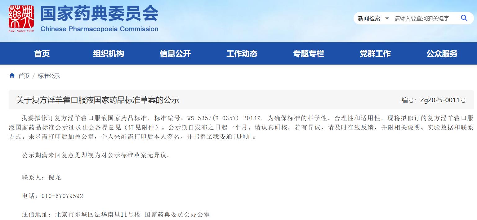 關于復方淫羊藿口服液國家藥品標準草案的公示