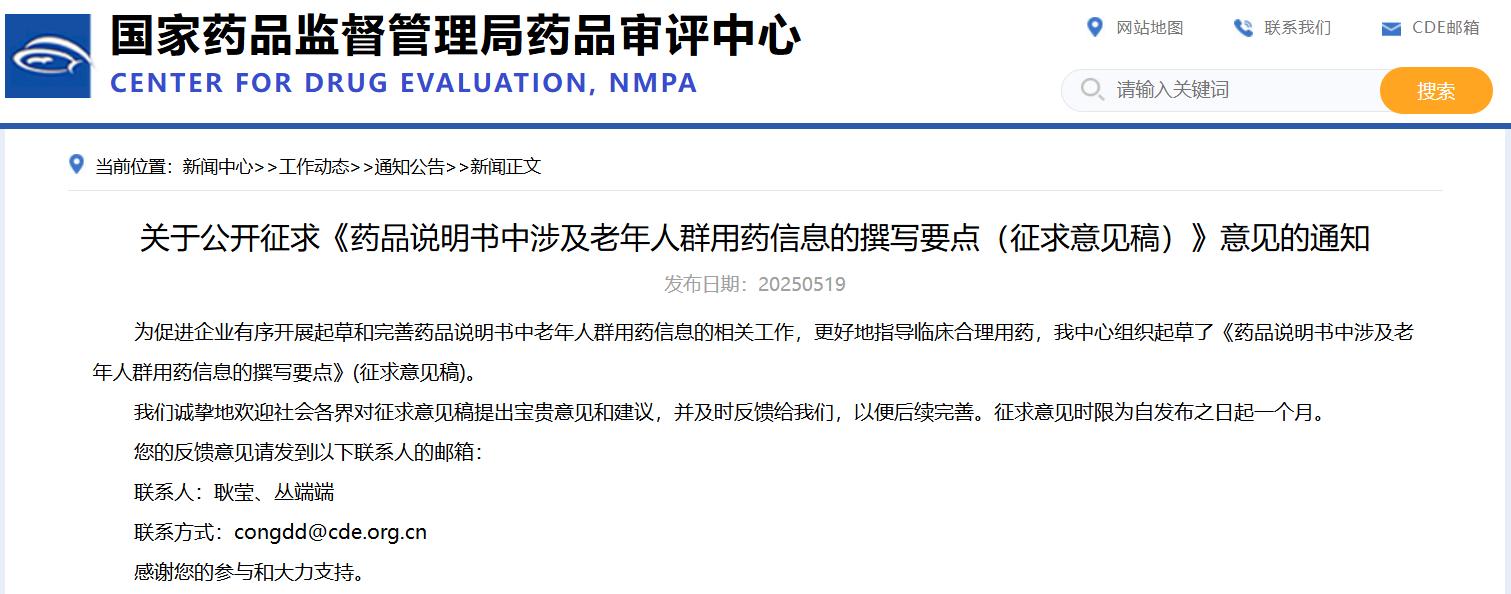 為促進企業有序開展起草和完善藥品說明書中老年人群用藥信息的相關工作,更好地指導臨床合理用藥,CDE組織起草了《藥品說明書中涉及老年人群用藥信息的撰寫要點》(征求意見稿)。