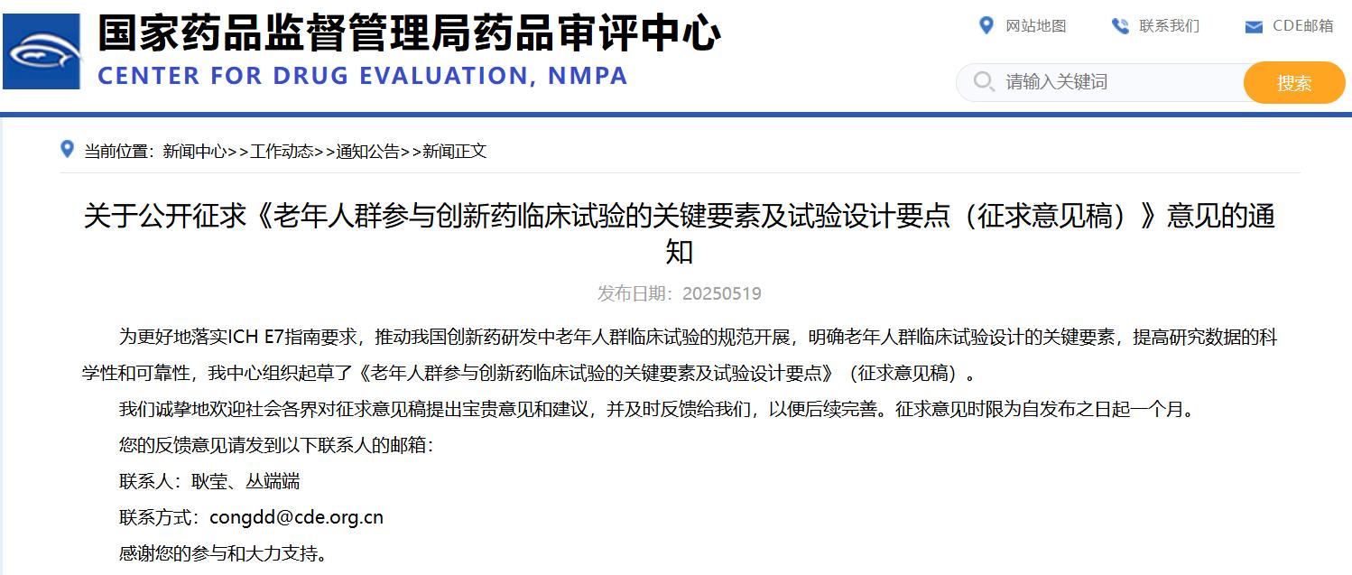 關于公開征求《老年人群參與創新藥臨床試驗的關鍵要素及試驗設計要點(征求意見稿)》意見的通知