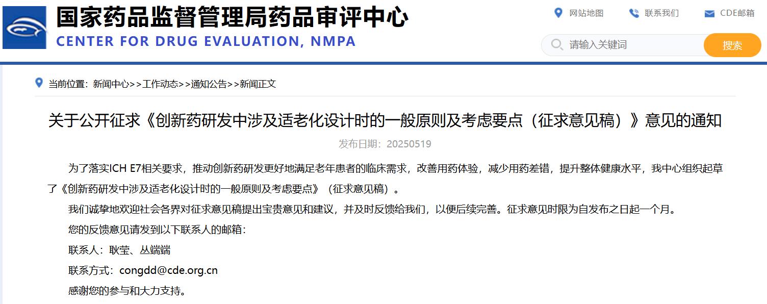 關于公開征求《創新藥研發中涉及適老化設計時的一般原則及考慮要點(征求意見稿)》意見的通知