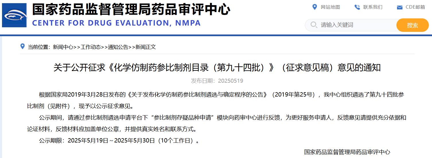 關于公開征求《化學仿制藥參比制劑目錄(第九十四批)》(征求意見稿)意見的通知