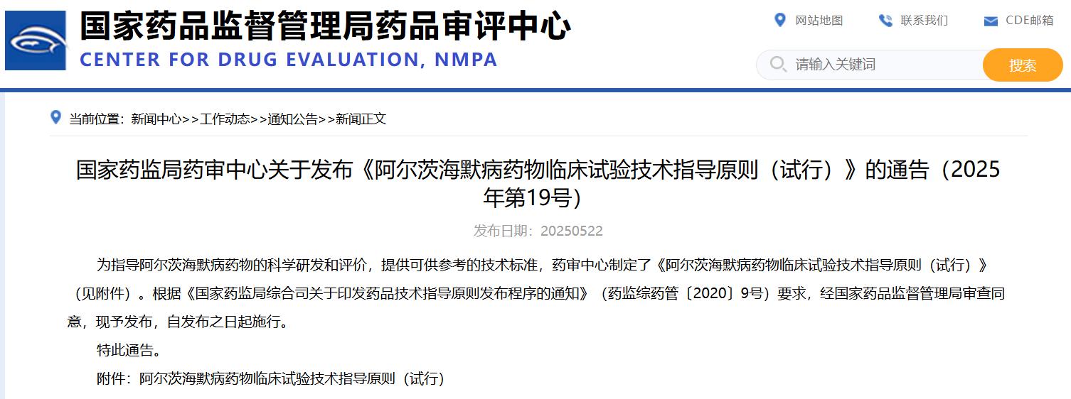 國家藥監局藥審中心關于發布《阿爾茨海默病藥物臨床試驗技術指導原則(試行)》的通告(2025年第19號)