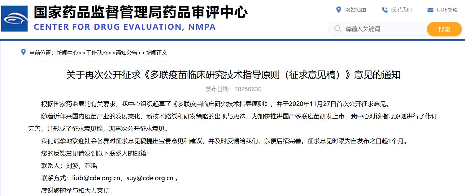 關于再次公開征求《多聯(lián)疫苗臨床研究技術(shù)指導原則(征求意見稿)》意見的通知