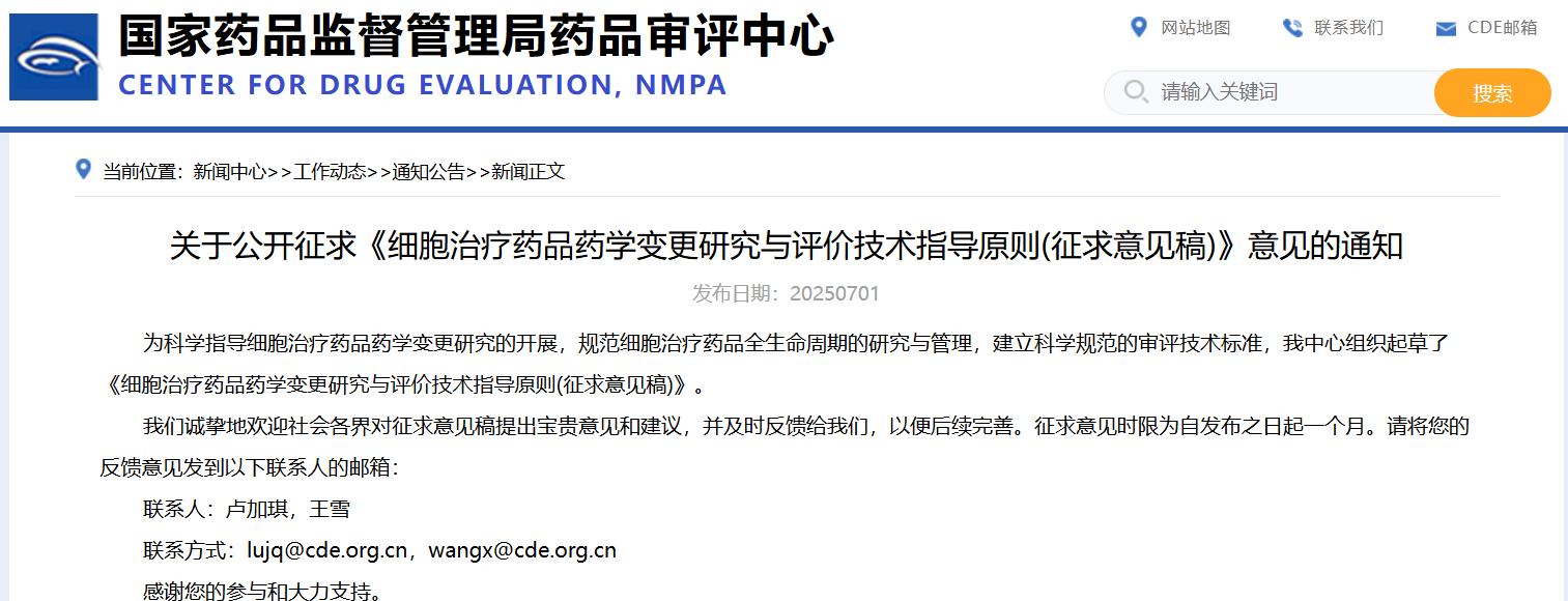 關于公開征求《細胞治療藥品藥學變更研究與評價技術(shù)指導原則(征求意見稿)》意見的通知