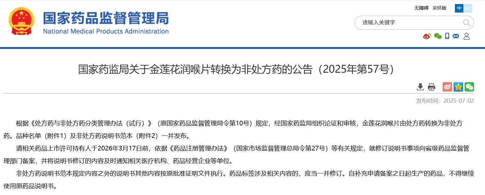 國家藥監(jiān)局關于金蓮花潤喉片轉(zhuǎn)換為非處方藥的公告(2025年第57號)