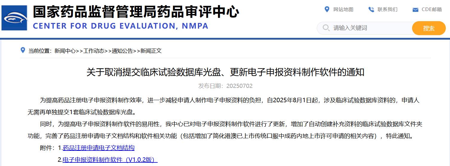 關于取消提交臨床試驗數(shù)據(jù)庫光盤、更新電子申報資料制作軟件的通知