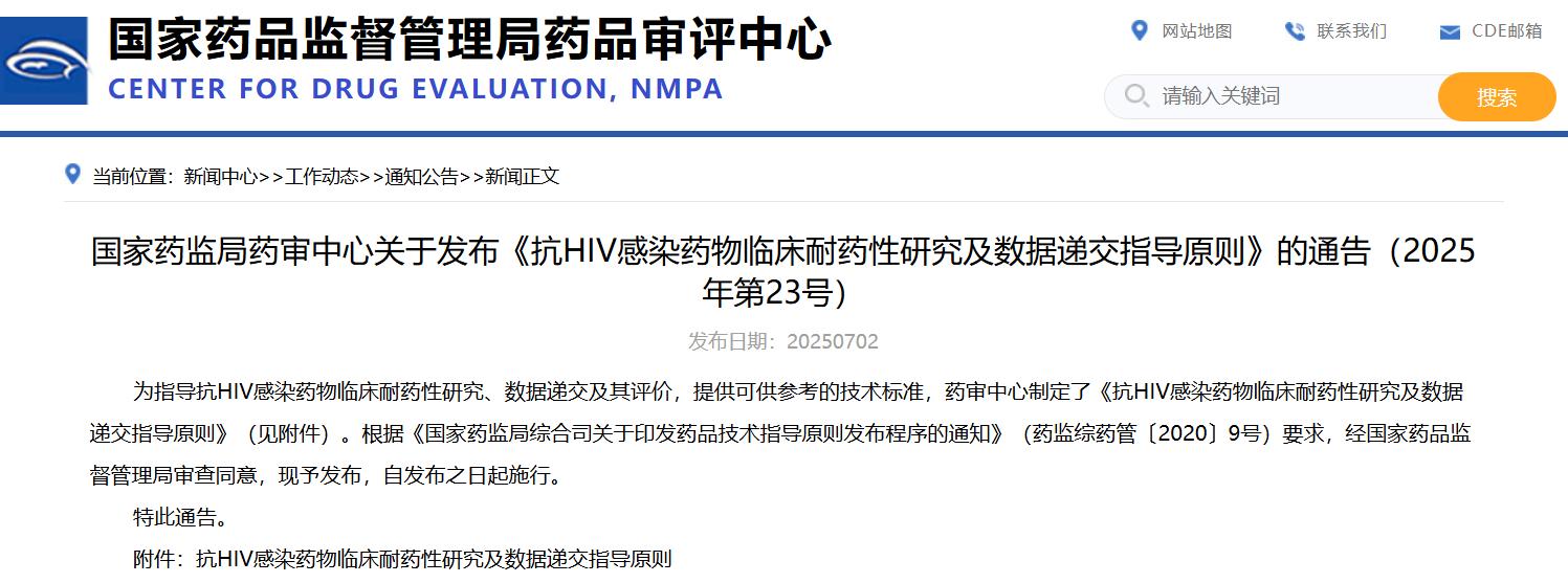 國家藥監(jiān)局藥審中心關于發(fā)布《抗HIV感染藥物臨床耐藥性研究及數(shù)據(jù)遞交指導原則》的通告(2025年第23號)