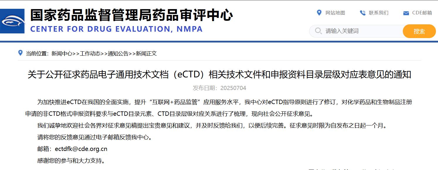關于公開征求藥品電子通用技術(shù)文檔(eCTD)相關技術(shù)文件和申報資料目錄層級對應表意見的通知