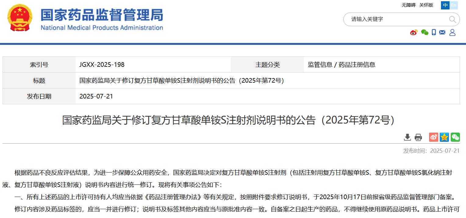 國家藥監局關于修訂復方甘草酸單銨S注射劑說明書的公告(2025年第72號)