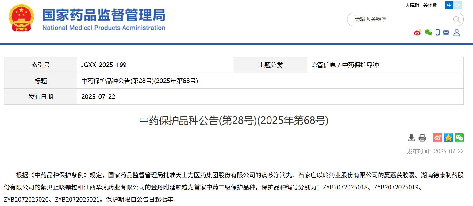 國家藥監局關于中藥保護品種的公告(延長保護期第23號)(2025年第70號)