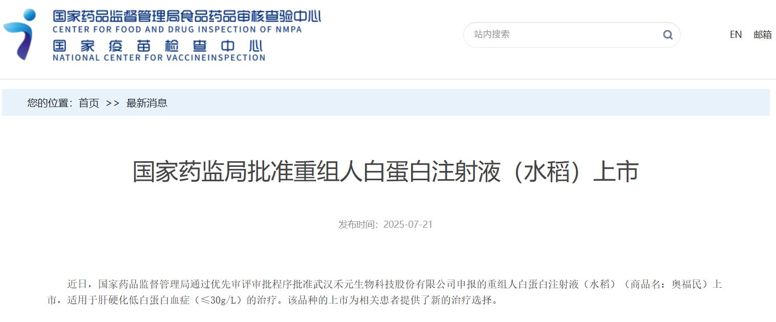 國家藥監局批準重組人白蛋白注射液(水稻)上市