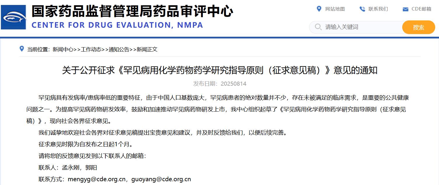 關于公開征求《罕見病用化學藥物藥學研究指導原則(征求意見稿)》意見的通知