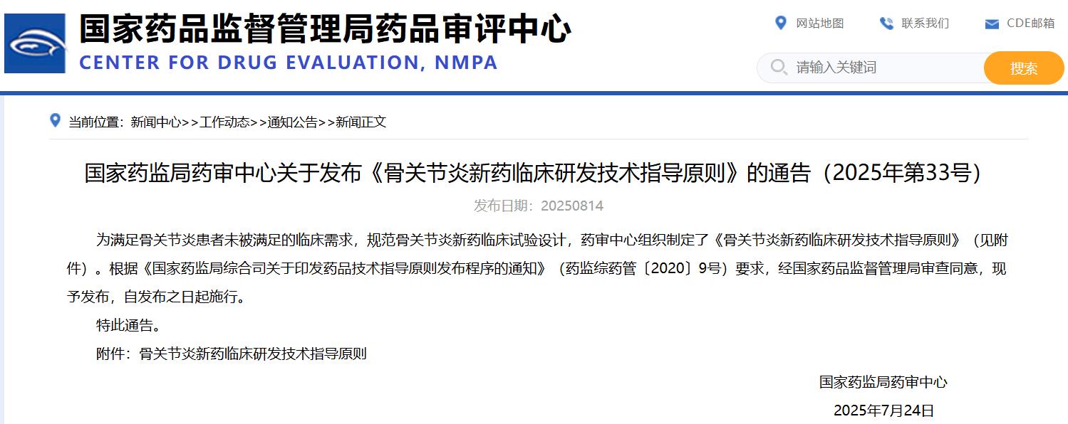 國家藥監局藥審中心關于發布《骨關節炎新藥臨床研發技術指導原則》的通告(2025年第33號)
