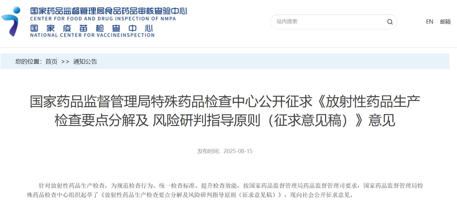 國家藥品監督管理局特殊藥品檢查中心公開征求《放射性藥品生產檢查要點分解及 風險研判指導原則(征求意見稿)》意見