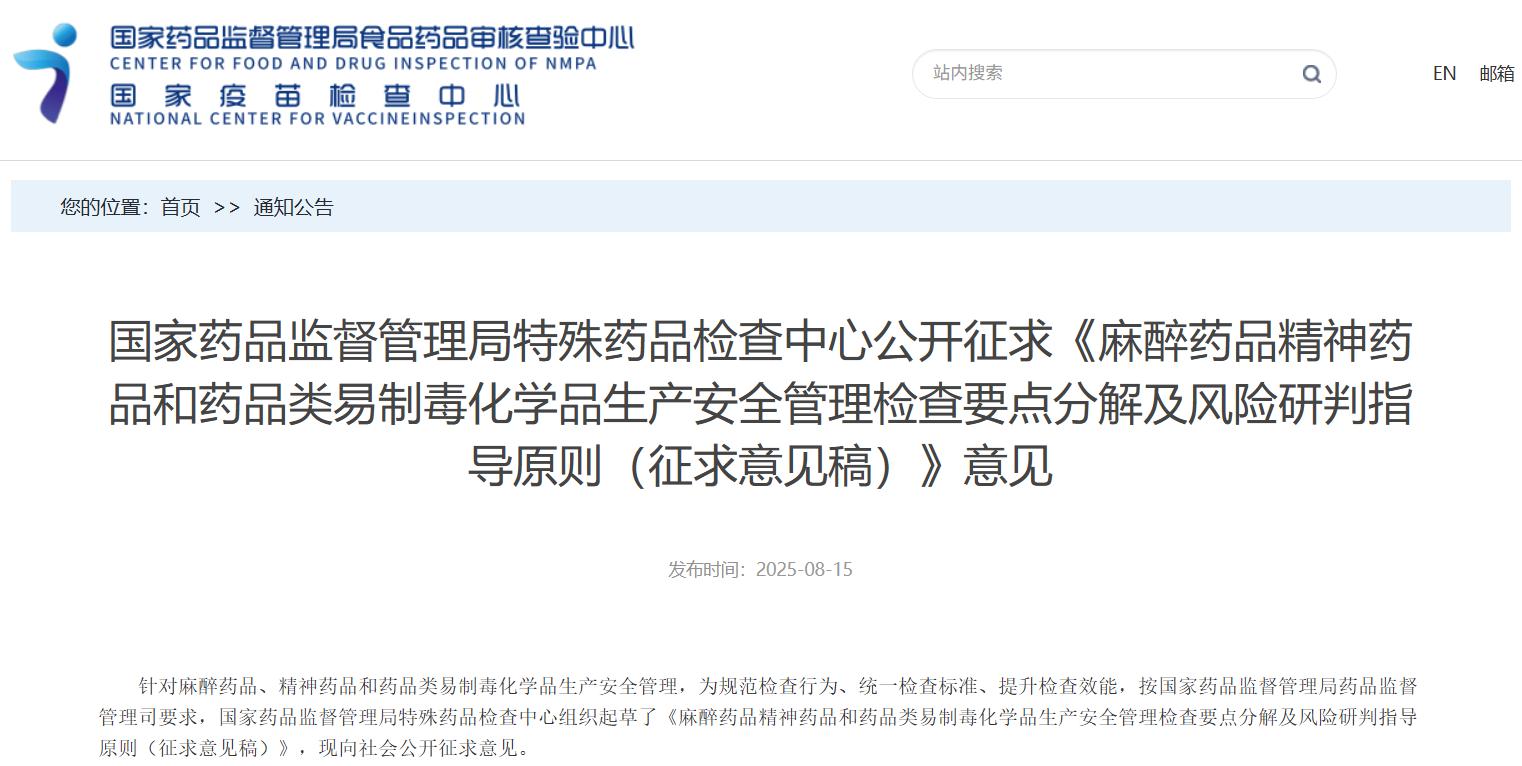 國家藥品監督管理局特殊藥品檢查中心公開征求《麻醉藥品精神藥品和藥品類易制毒化學品生產安全管理檢查要點分解及風險研判指導原則(征求意見稿)》意見