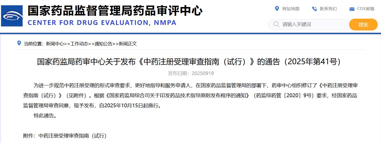 國家藥監局藥審中心關于發布《中藥注冊受理審查指南(試行)》的通告(2025年第41號)