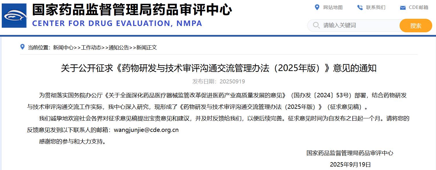 關于公開征求《藥物研發與技術審評溝通交流管理辦法(2025年版)》意見的通知