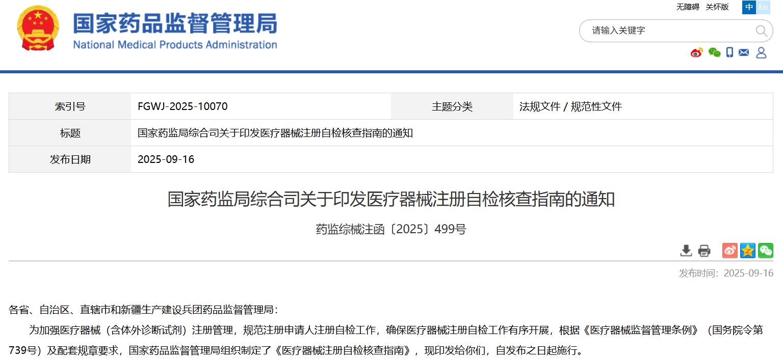 國家藥監局綜合司關于印發醫療器械注冊自檢核查指南的通知