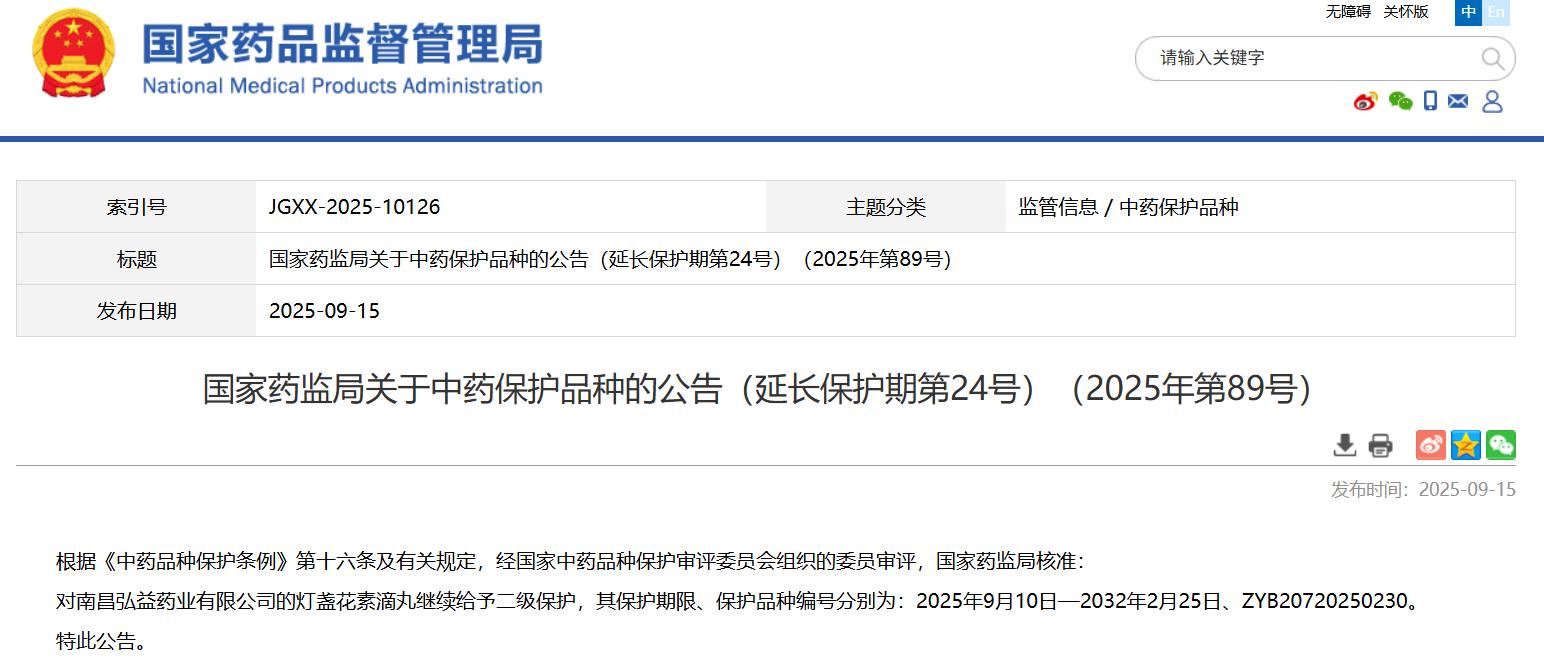 國家藥監局關于中藥保護品種的公告(延長保護期第24號)(2025年第89號)