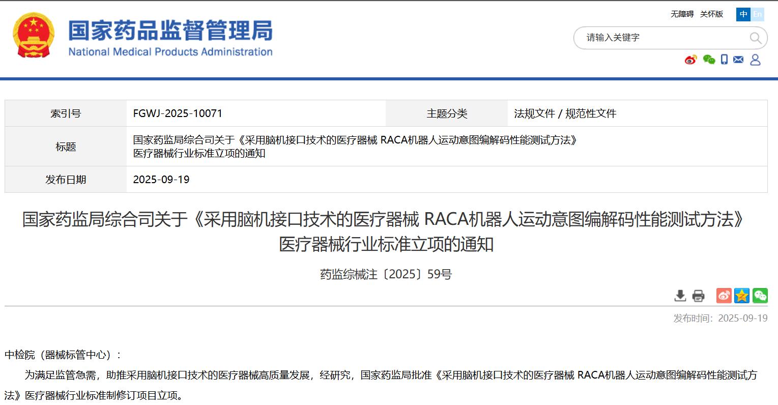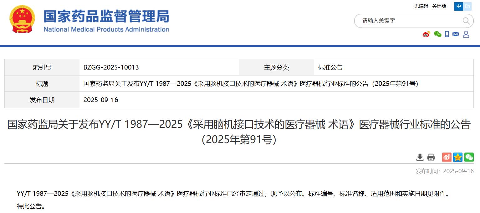 國家藥監局關于發布YY/T 1987—2025《采用腦機接口技術的醫療器械 術語》醫療器械行業標準的公告(2025年第91號