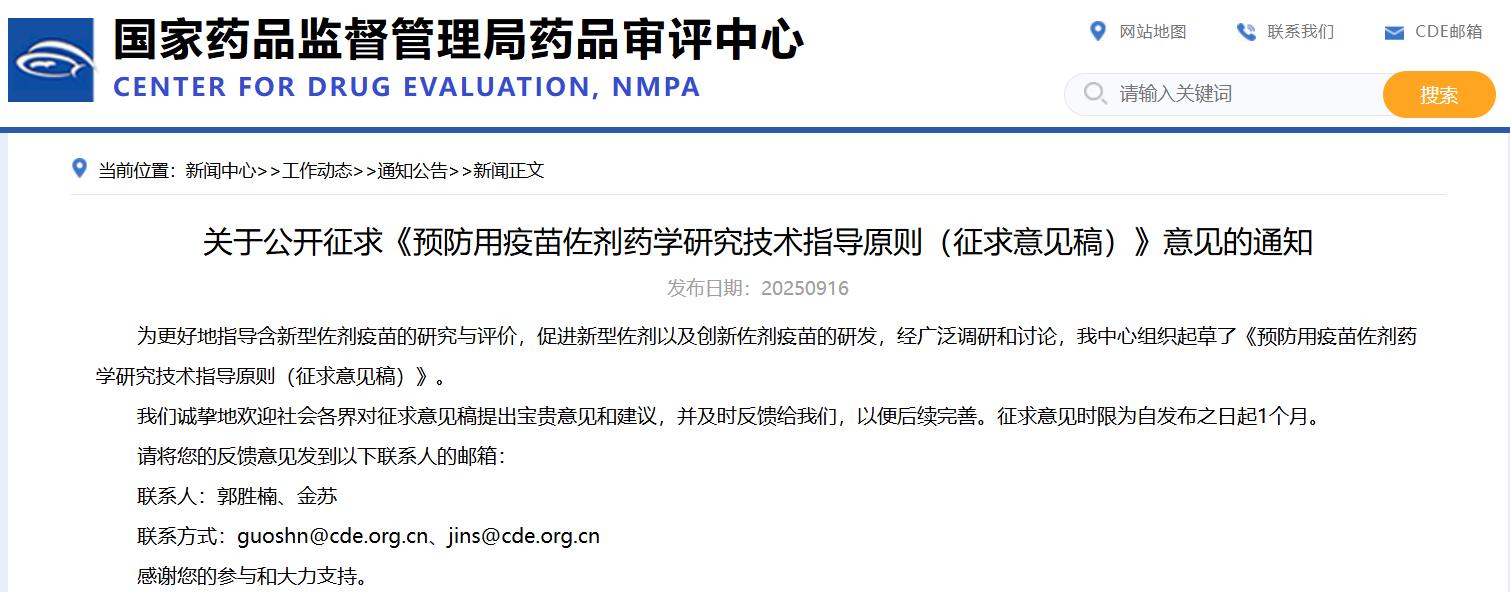 關于公開征求《預防用疫苗佐劑藥學研究技術指導原則(征求意見稿)》意見的通知